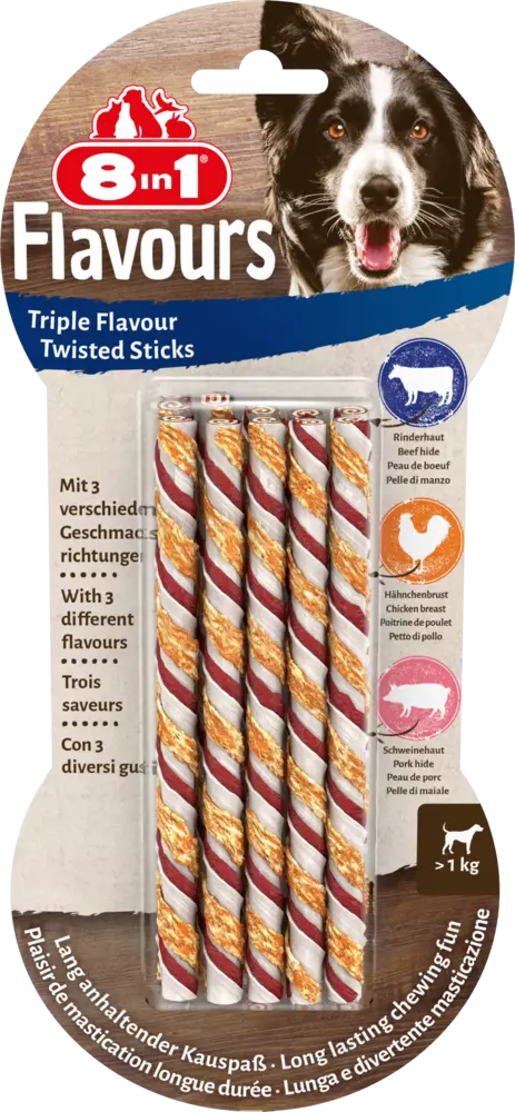Our incredibly tasty 8in1 Flavours Triple Flavour Twisted Sticks combine three delicious flavours of chewy pork hide and beef hide, wrapped in deliciously succulent chicken breast for that extra tasty flavour experience. These long-lasting chewy twisted sticks help to control tartar and plaque build-up due to their natural abrasive action while chewing. They are rich in protein, low in fat and contain no added sugar, no flavour enhancers and no artificial preservatives, making them the ideal reward or snack for all size dogs to enjoy. Additionally, they do not contain GMOs and are even oven baked, which not only helps to make them long-lasting, but also to preserve the valuable nurtrients. Keep your dog happily busy with our 8in1 Triple Flavour Twisted Sticks.