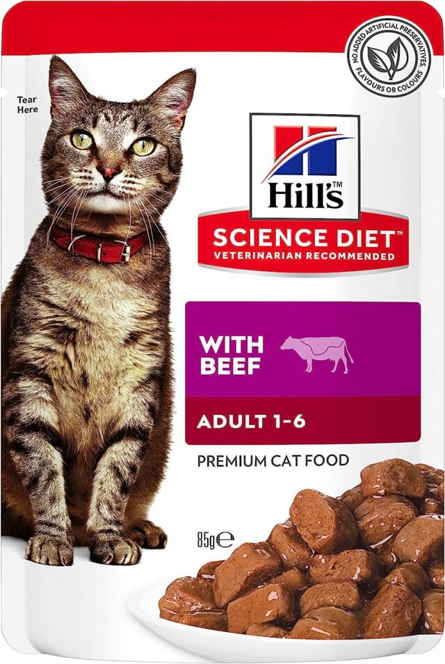 Precisely balanced nutrition to support immunity, healthy digestion and lean muscles in cats. Your cat will love the taste of Hill’s Science Diet Adult Beef wet cat food tender chunks in gravy. It has the perfect balance of taste and nutrition and is specially formulated to fuel the energy needs of cats during the prime of their life. Serve this gourmet daily nutrition as a balanced meal by itself or try it on top of Science Diet adult dry cat food.
