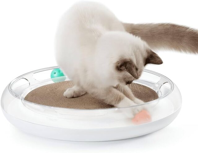 The PETKIT Swipe 4 in 1 Cat Scratcher is guaranteed to provide your best friend with endless fun. It satisfies all your cat’s needs by offering hours of entertainment, but also by providing a nice place to rest. A round scratcher at the center is made with high-density thickened corrugated board that is hard to destroy and is solid and durable. It encourages cats to use that as their playground and not your home furniture. The large surface gives a lot of room to curl up and nap afterward. A unique circular track design has two removable ball toys that your cat can bat around and around. The green ball toy has catnip inside while the orange ball has a fun bell sound.