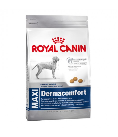 ROYAL CANIN? Dermacomfort Maxi is tailored with active nutrients that help to support your dog?s skin health. Enriched with Omega 3 and 6 fatty acids, this food helps to soothe the skin, making it less sensitive to irritants that may be present in your dog?s environment. What?s more, these nutrients also help to maintain your dog?s good coat health. Suitable for dogs that weigh between 26kg and 44kg, ROYAL CANIN? Dermacomfort Maxi contains specially designed kibble that fits perfectly between your dog?s teeth. We take proteins very seriously, which is why we only use the highest quality and adapt the type of protein to align with your dog?s exact needs.