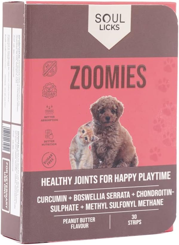 WHAT IS ZOOMIES? > Soul Licks Zoomies keeps your pet?s joints in optimum health & relieves pain naturally. We?ve packed all the most effective & safe ingredients in a tiny little strip, all for your little playful pet.